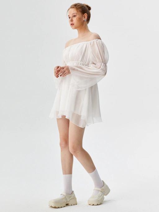 Simulation von weißem transparentem Chiffon mit hohem Stofffluss auf einer Standard-Silhouette eliminiert den plastischen Look, der die hohen Kosten professioneller Fotoshoots für Kleider-Verkäufer verursacht. Dies garantiert Materialrealismus für KI-generierte Modebilder.