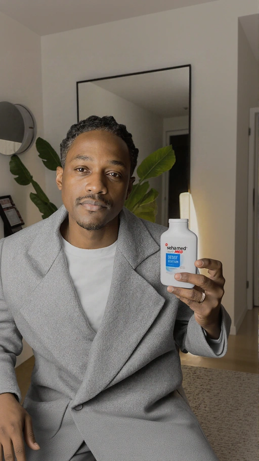 부드러운 좌측 전방 주광원은 디지털 아티팩트 없이 병에서 손까지 연속적인 그림자 그라데이션을 생성합니다. 균등한 조명과 45도 각도는 세럼의 원통형 형태를 명확히 드러내며, 그림자 길이를 통해 10cm 높이를 검증하여 인공적 보정 없이 실물 크기를 확인합니다.