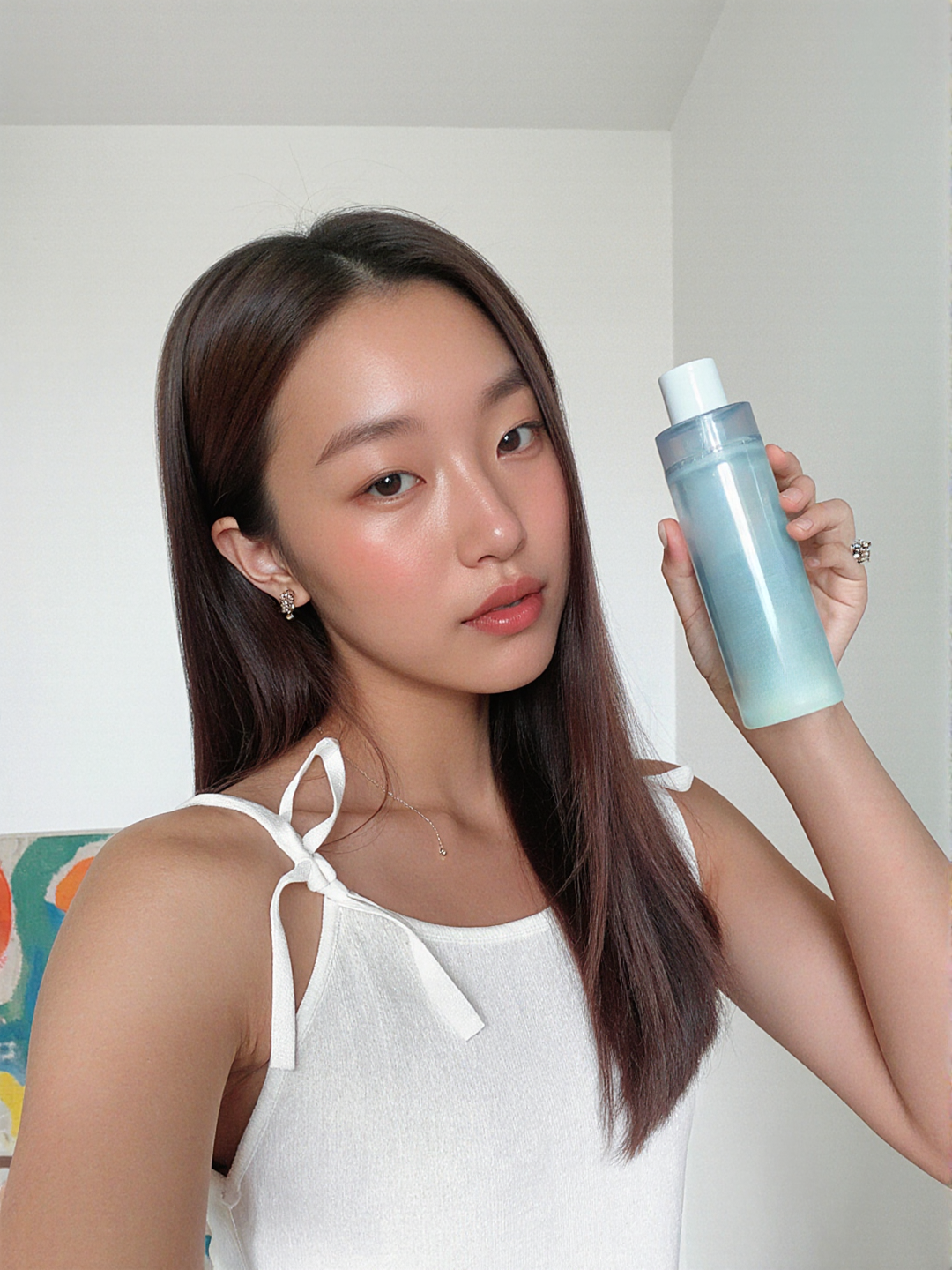 Nude polish with ring and warm skin undertone align with the light blue bottle, enhancing North American market appeal for daily skincare routine products.