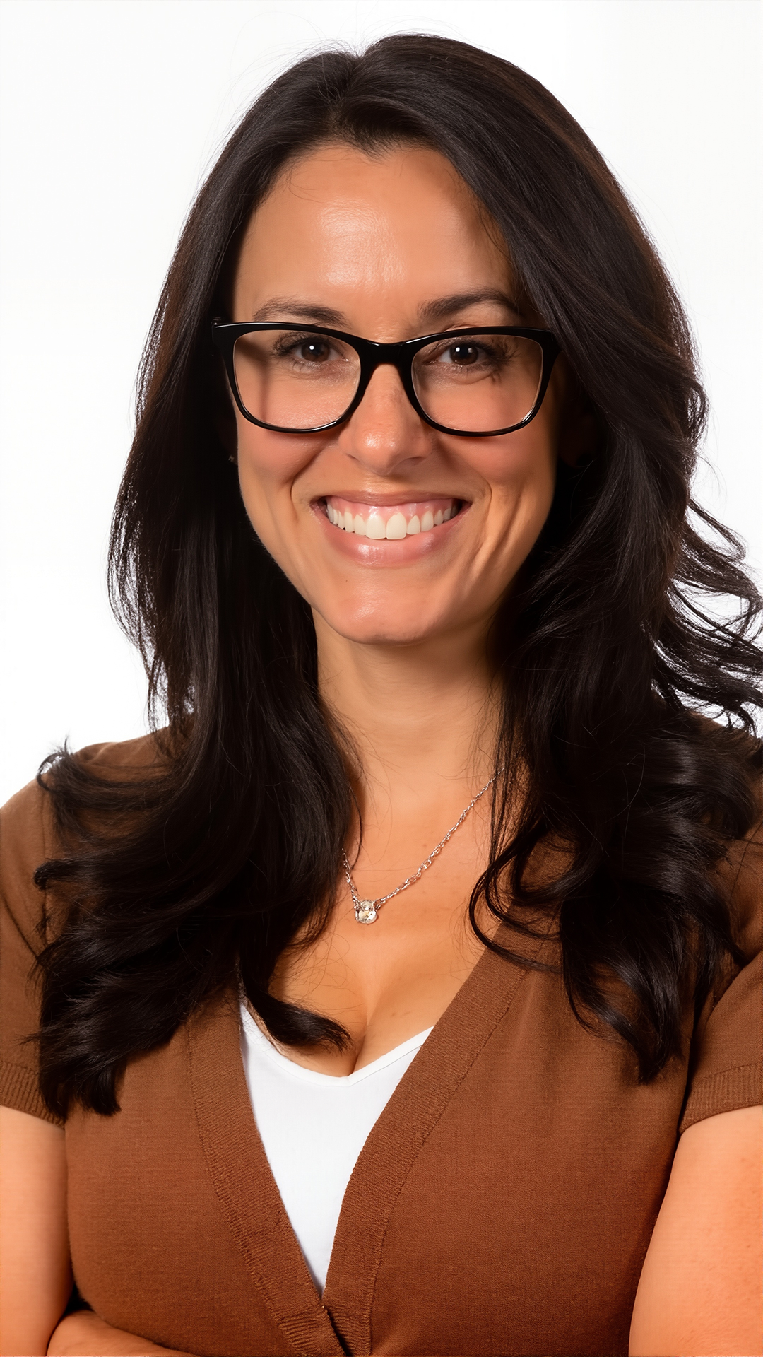 High-key Studio Lighting at a Frontal View angle within the Plain White Studio Background creates a Professional and Confident environment. This feminine eyeglasses, prescription glasses, and eyeglass frame accuracy for virtual try-on.