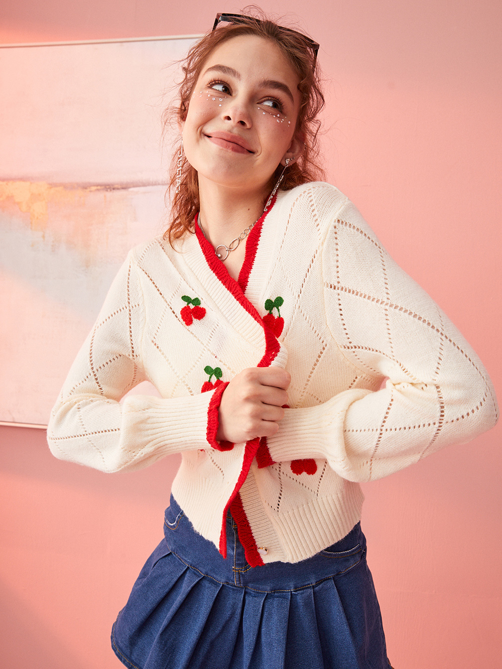 Blush Pink soft knit fabric with diamond pattern and red trim on a Standard body type. The medium weight material's realism eliminates plastic look, resolving high-cost image production for Cardigans sellers.