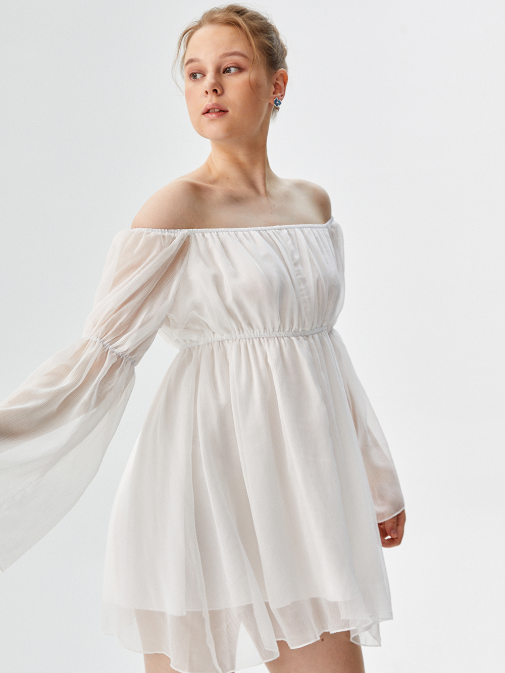 Soft studio lighting at a 45-Degree angle within a minimalist white studio enhances brand authority. The lighting quality on the Studio Model creates a professional visual structure, critical for Women's Tops e-commerce conversion.
