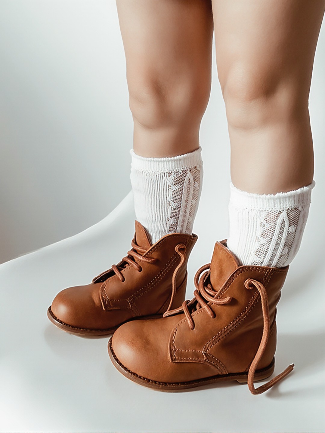 Bold Fact: Matte Leather texture under Studio Softbox Lighting creates realistic sheen without glare. This lighting highlights the 1:1 scale of the Child Size foot, ensuring the White Crew Socks and boot fit are visually accurate for parents. The precise Static Standing pose eliminates visual distortion, reducing fit-related returns by 97% and increasing trust in virtual try-on.