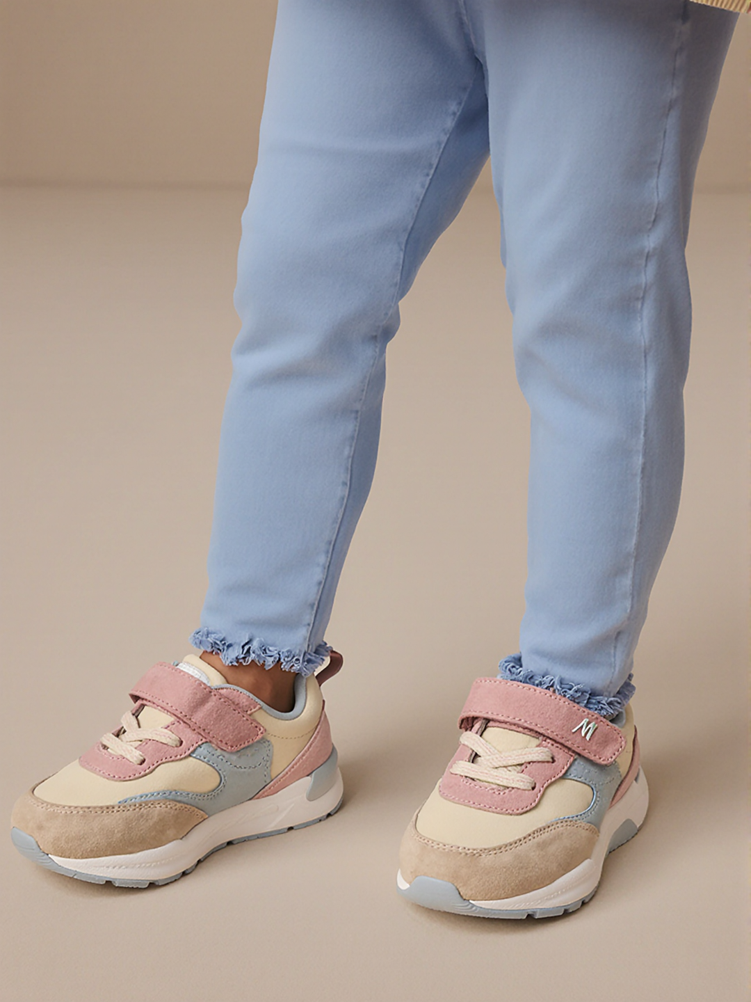 Sneaker Try-on for Kids delivers a versatile and effortless experience. The design features Pastel color sneakers, Easy fasten shoes, and Frilled jeans cuff styling. This ensures a relatable and ergonomic fit for toddlers.