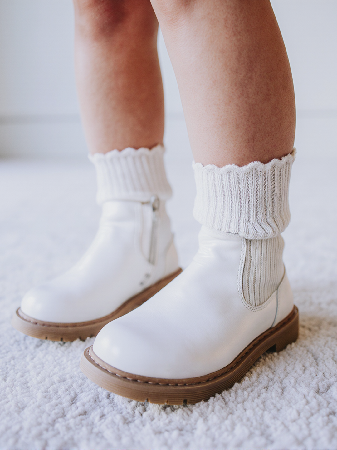 The White Crew Socks and Socks above boot styling are critical for capturing high-intent Kids' Shoes traffic. This authentic pairing resonates with global parents seeking realistic fit validation for children's footwear.