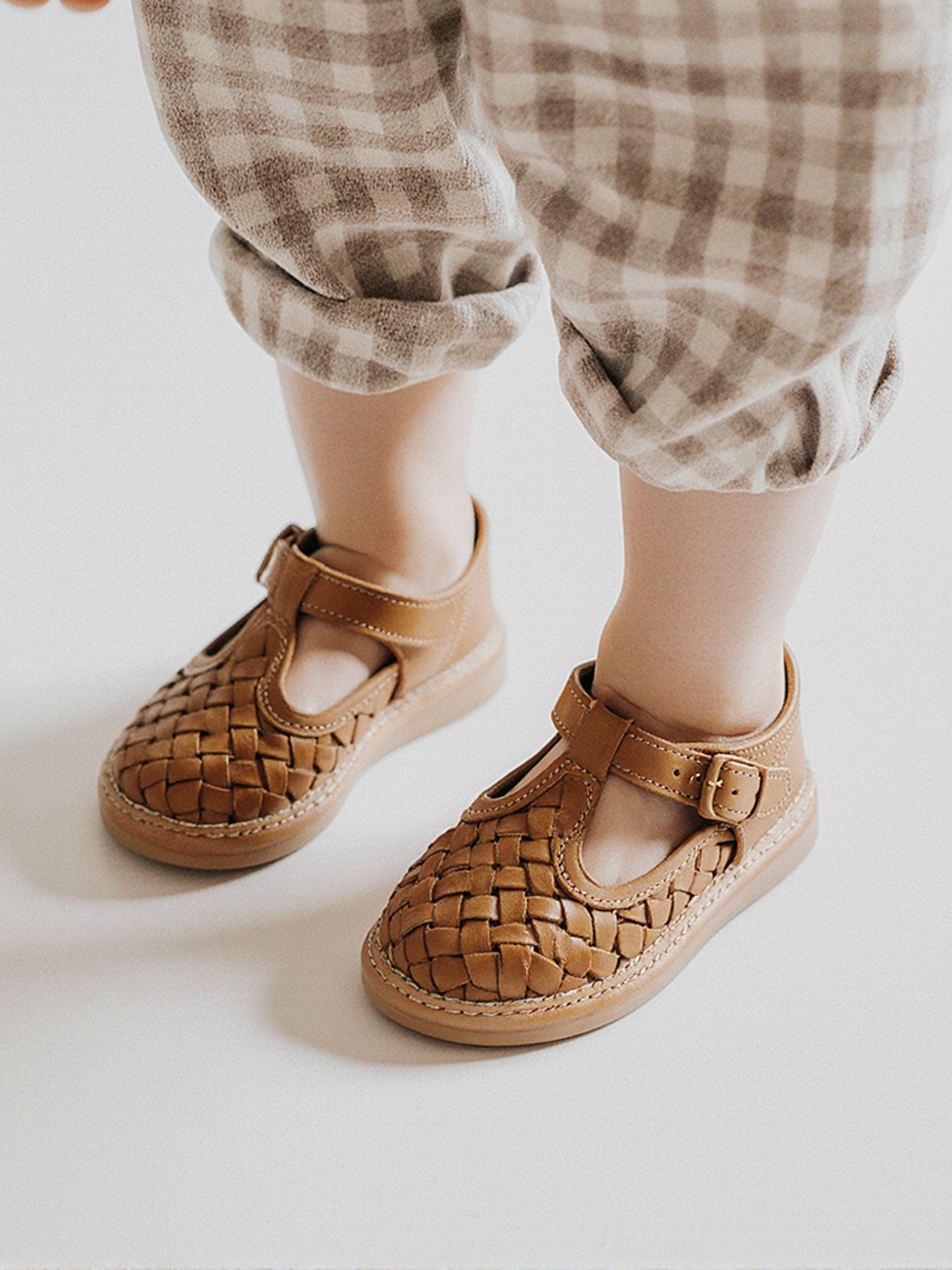 Shoes on Model AI for Kids' Shoes. Woven Sandals with T-Strap Design and Comfortable Flat style. The woven leather texture is shown on a child size model in static standing. This resolves sizing accuracy for kids shoes.