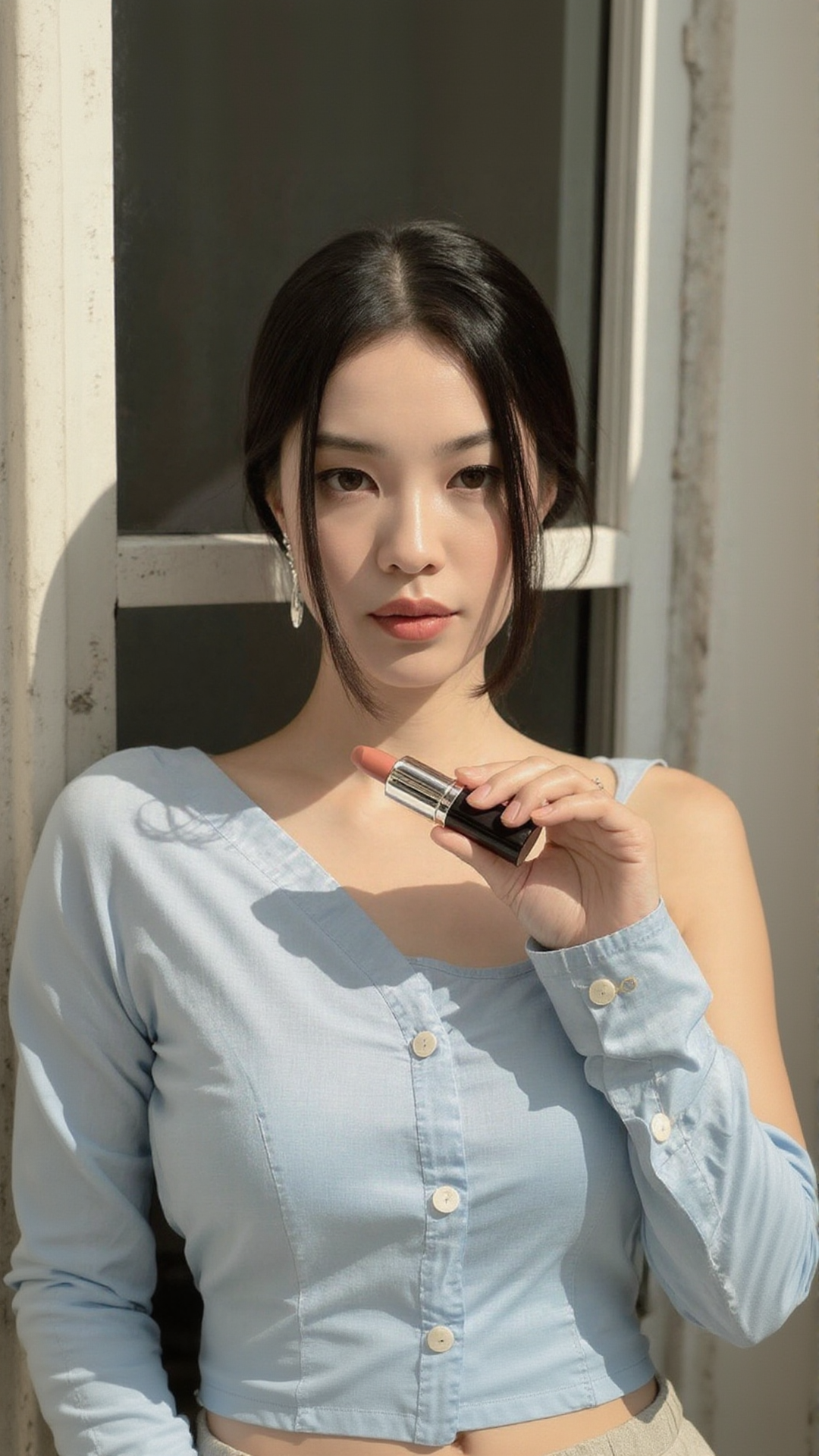 The smooth plastic casing and visible finger grip generate a distinct contact shadow that reveals skin indentation. This proves the lipstick's physical weight and scale, eliminating AI artifacts by showing micro-engineered pressure points.