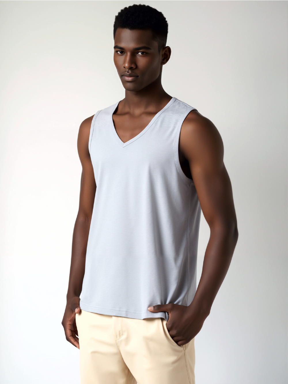 Simulating light gray lightweight knit fabric with smooth drape on a muscular athletic silhouette eliminates the plastic look that causes high cost of hiring professional models for sleeveless shirts sellers. This AI-generated fashion imagery scales for e-commerce without physical models.