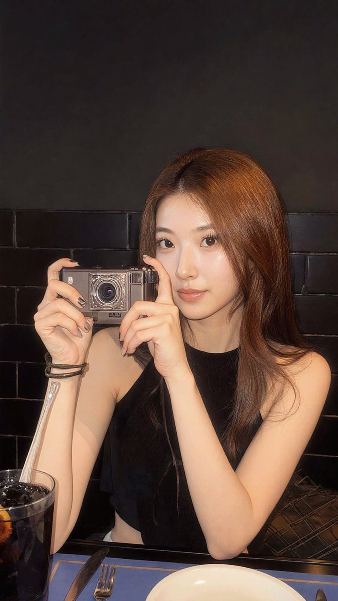 The glossy dark blue nail polish complements the camera's analog finish, creating a cohesive vintage aesthetic for North American cafe lifestyle scenarios. This color harmony enhances visual trust for target buyers seeking authentic photography gear.