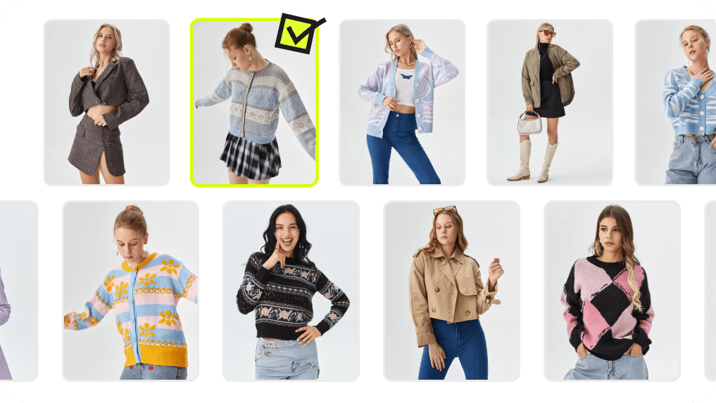Thay thế ma-nơ-canh hoặc người mẫu thật trong vài giây. Công cụ hoán đổi người mẫu kỹ thuật số bằng AI giữ nguyên vải vóc, ánh sáng và góc máy. Dù bạn cần thay khuôn mặt, toàn bộ cơ thể hay tạo người mẫu với nhiều đặc điểm khác nhau, mọi thứ đều tự động — không cần chỉnh sửa hay thiết lập gì thêm.